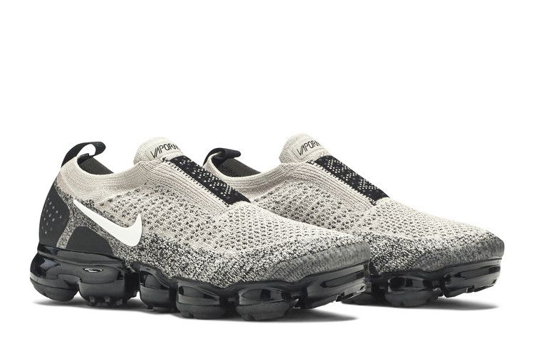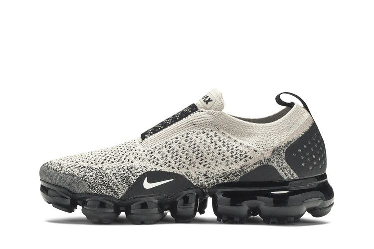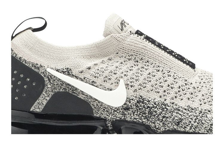 The Nike Air VaporMax Moc 2 Moon Particle W features a breathable synthetic upper in Moon Particle, white, and black. It includes a heel tab for easy wear and a laceless design with an elastic strap. The Air VaporMax sole provides cushioning with individual Air pods for responsive comfort.