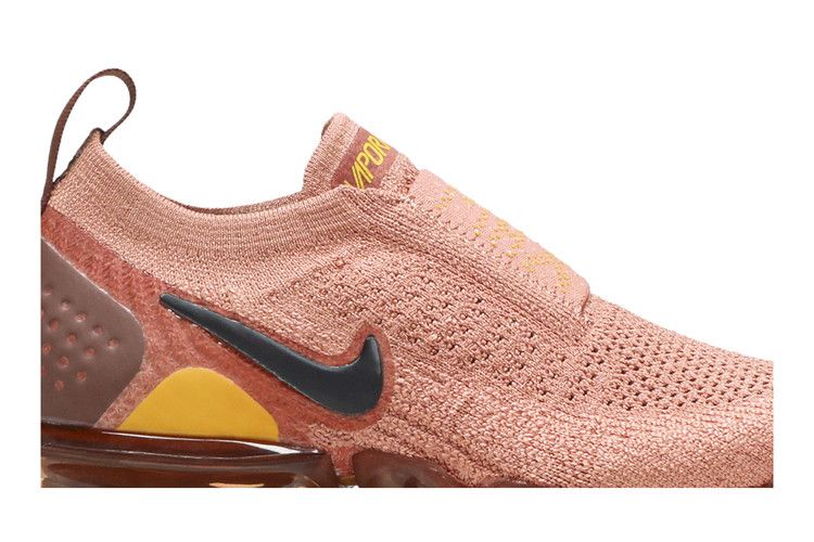 The Nike Air VaporMax Moc 2 Terra Blush (Women's) features a clear VaporMax unit in a terra blush undertone, replacing the solid midsole. The Flyknit upper includes enlarged vamp spaces and terra blush quarter panels. A black Swoosh sits on the lateral side with a yellow ochre reinforcement patch, while the medial side displays a smaller yellow Swoosh.
