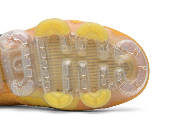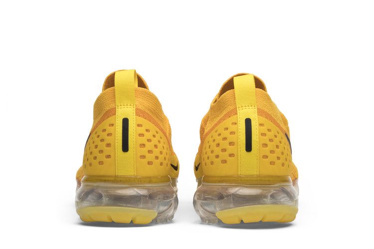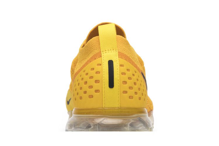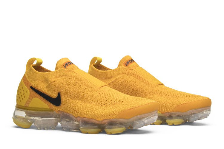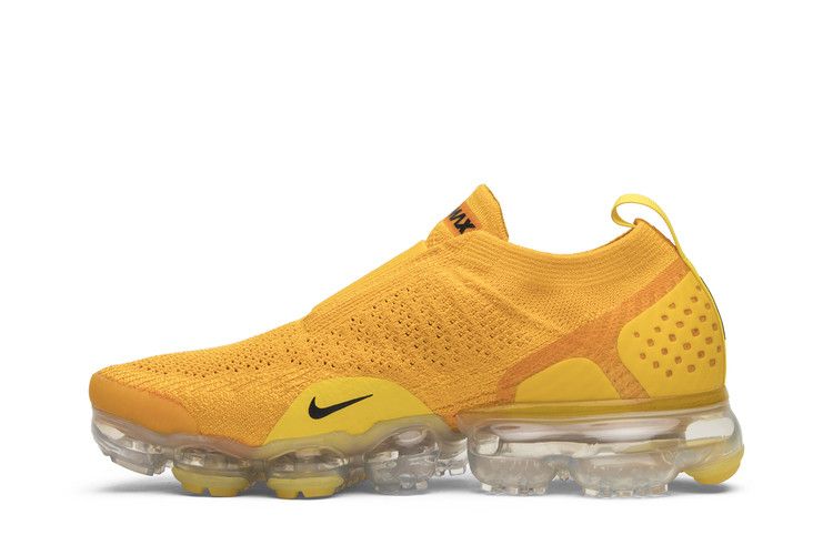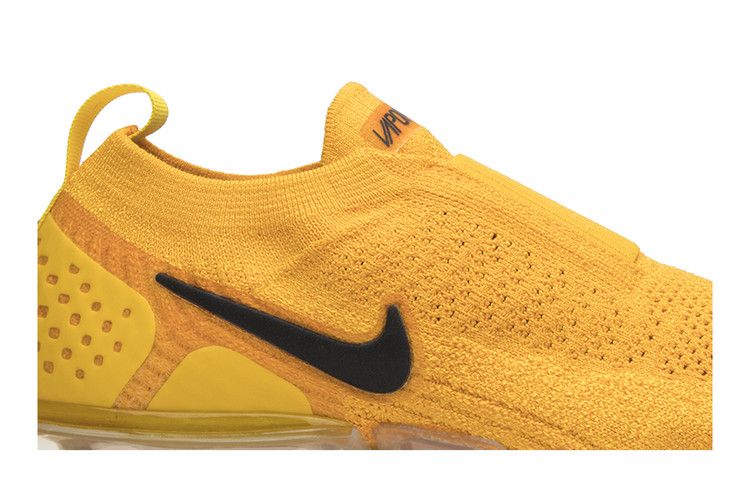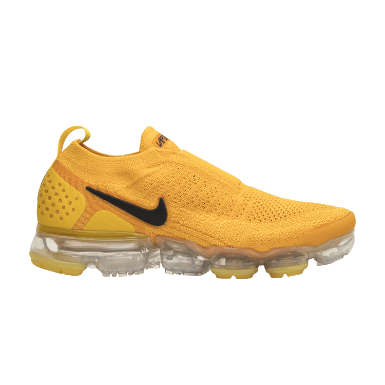 The Nike Air VaporMax Moc 2 University Gold W features a Flyknit upper in bright gold with a contrasting black Swoosh. The design includes a plastic heel cage, single-heel pull...