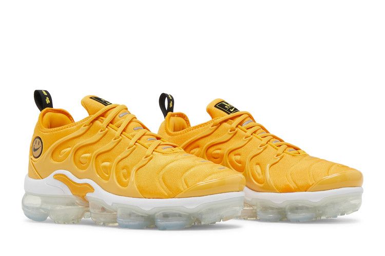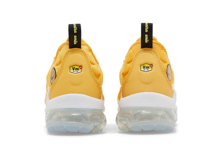 The Nike Air VaporMax Plus Go The Extra Smile (Women's) features a bright-yellow upper with TPU overlays and reflective accents on the tongue and toe box. The clear VaporMax sole provides cushioning and balance. Unique details include a smiley face on the lateral heel and matching sock liner graphics. Released on November 18, 2021, the Nike Air VaporMax Plus Go The Extra Smile (Women's) is available now at Side Kicks.