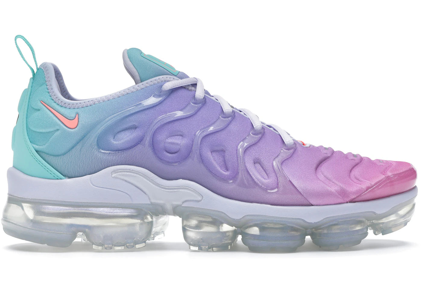 The Nike Air VaporMax Plus Sherbet (Women’s) features a gradient upper in pink, orange, and purple hues, inspired by sherbet desserts. The TPU cage provides midfoot support and structural reinforcement. Its sole combines Air Max cushioning with VaporMax Air technology for responsive comfort. Released on March 1, 2018, the Nike Air VaporMax Plus Sherbet (Women’s) is available now at Side Kicks.