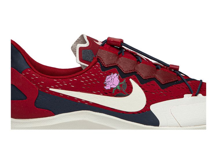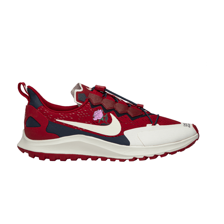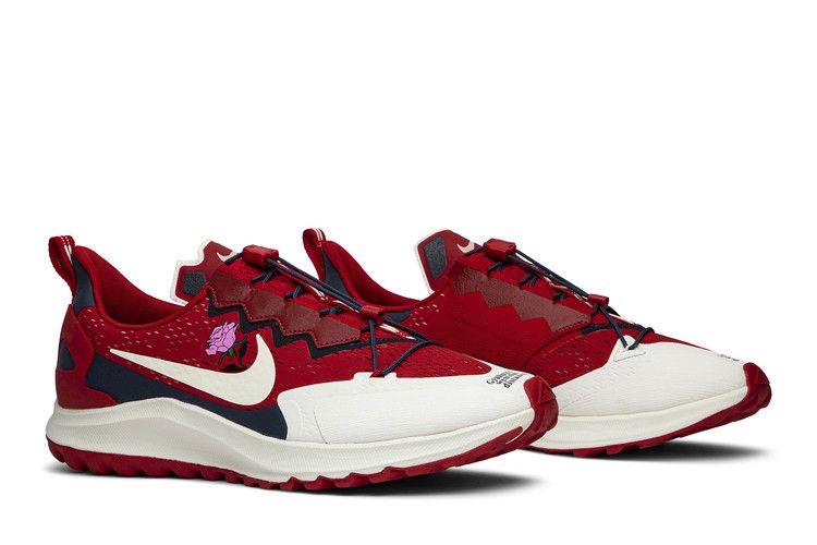 The Nike Air Zoom Pegasus 36 Trail Gyakusou Red has a red mesh and leather upper with a white base, transitioning to vibrant red panels. Breathable mesh pairs with a secure lacing system, while a printed pink floral graphic accents the side.