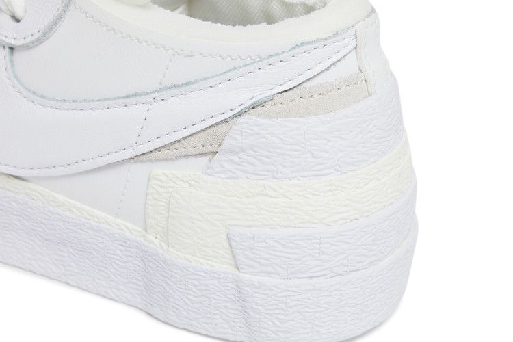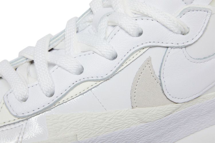 The Nike Blazer Low sacai White Patent Leather features a glossy white patent leather upper. It includes doubled tongues, eyestays, and laces, highlighting sacai's deconstructed design approach. A stacked midsole completes the avant-garde aesthetic.
