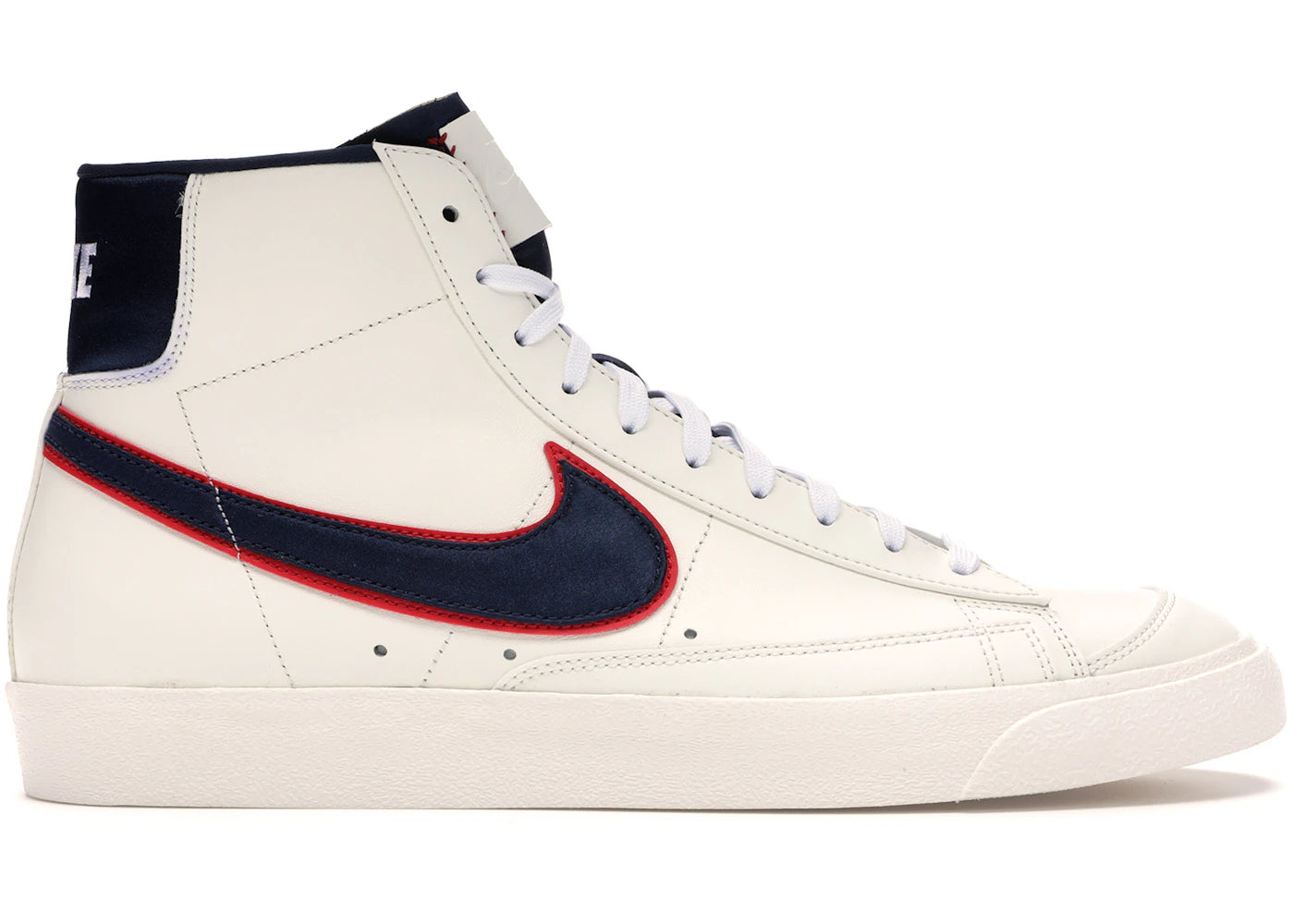 The Nike Blazer Mid 77 City Pride Chicago features a cream upper with a navy Swoosh accented in red. It has a cream midsole and brown rubber sole for traction. Released on May 2019, the Nike Blazer Mid 77 City Pride Chicago is available now at Side Kicks.