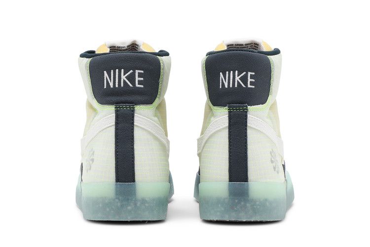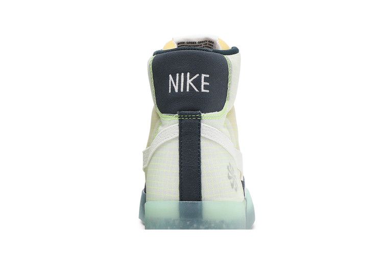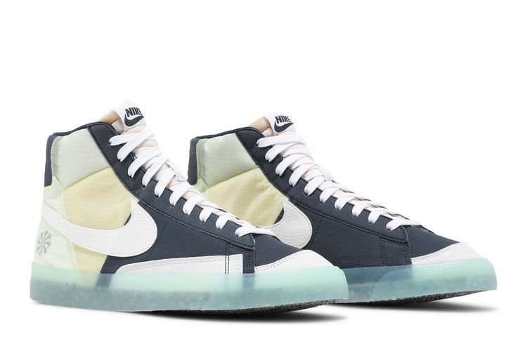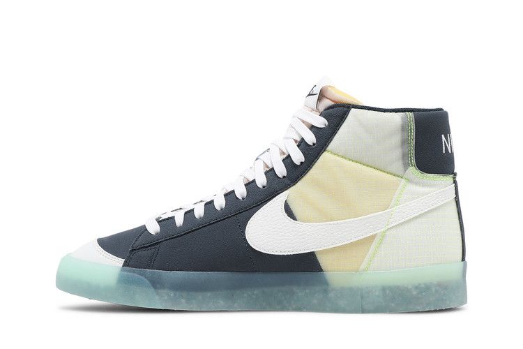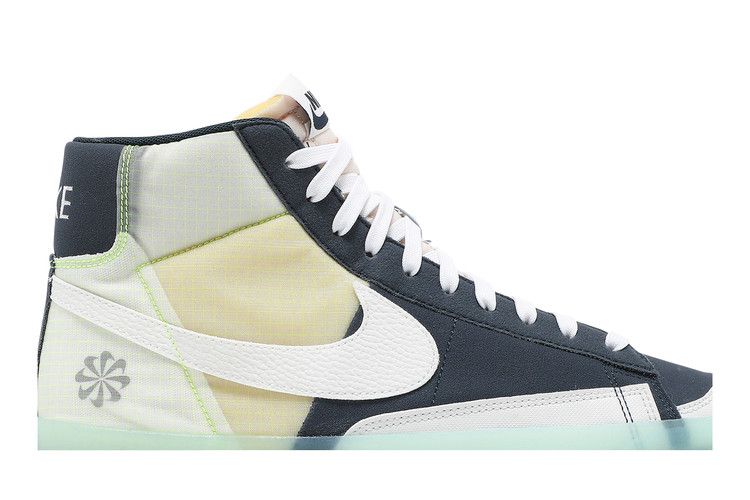 The Nike Blazer Mid 77 Move to Zero Armory Navy features a Summit White, Glacier Ice, and white color scheme. It combines grey suede on the forefoot with yellow ripstop...