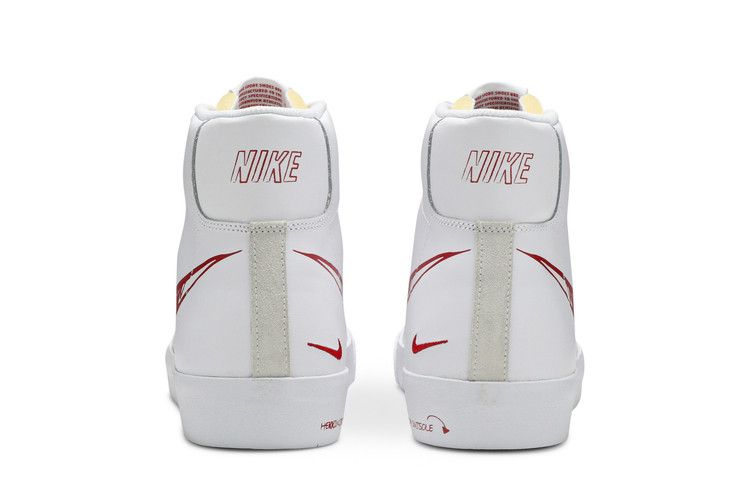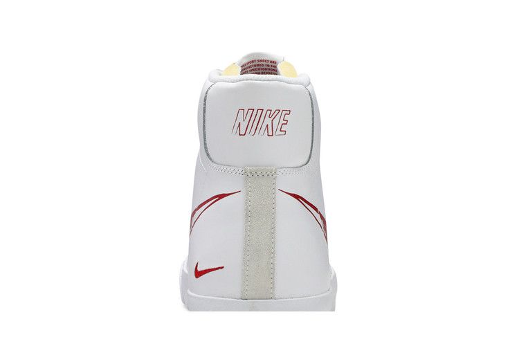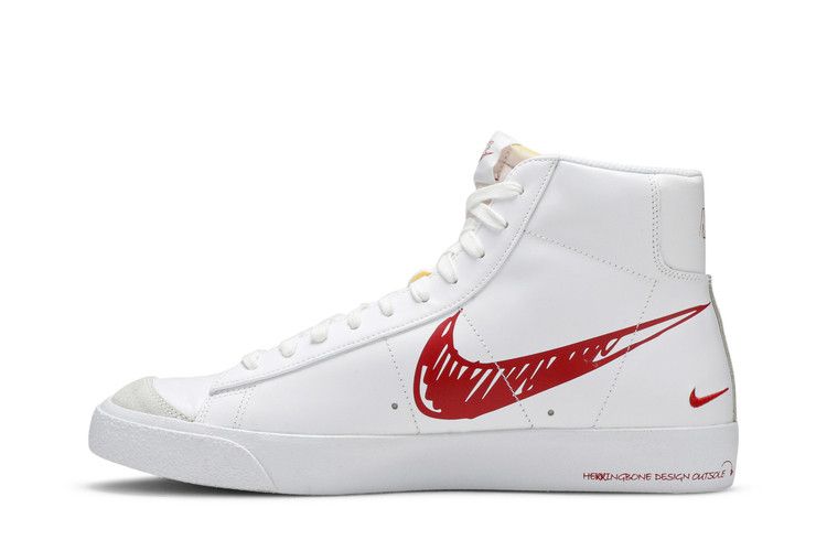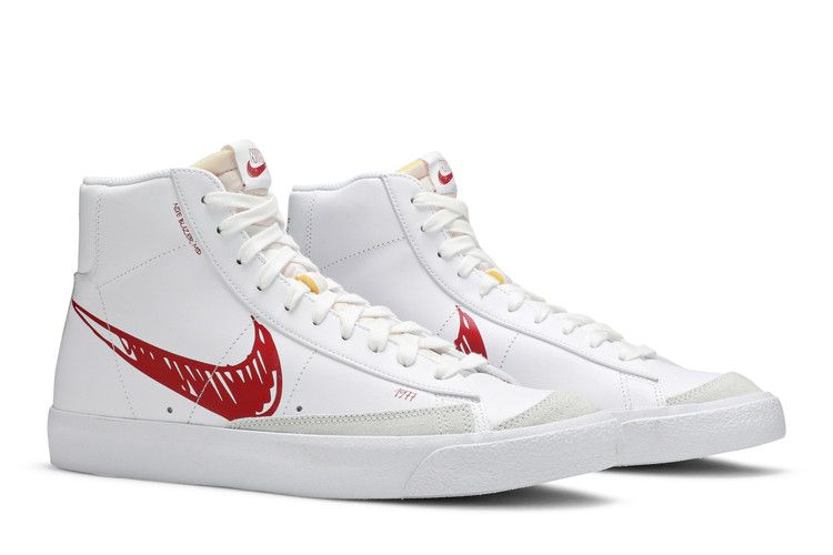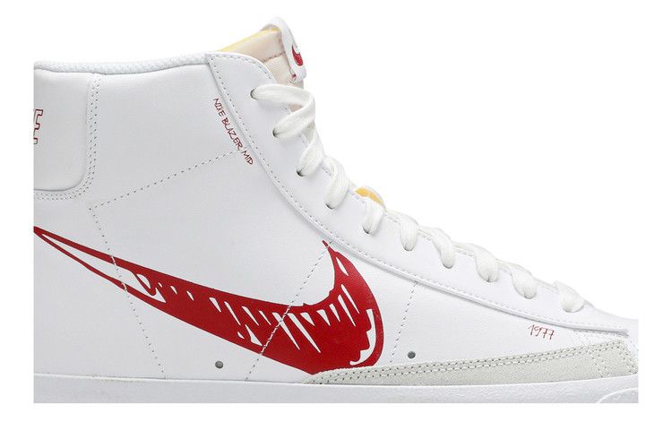 The Nike Blazer Mid 77 Sketch White Red features a high-top design with a summit white and gym red-sail colorway. It combines a white leather upper with red suede overlays...