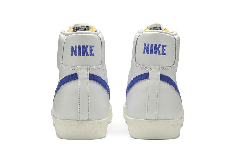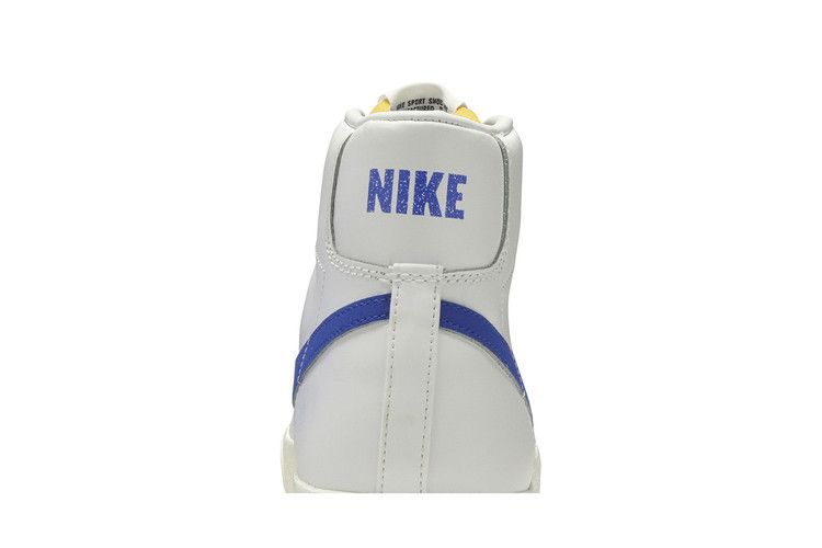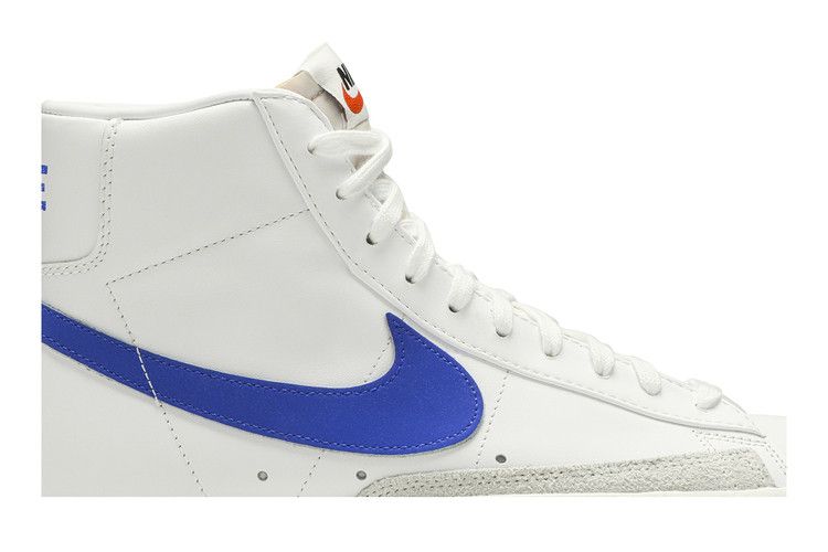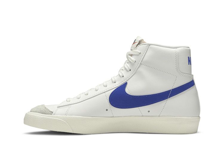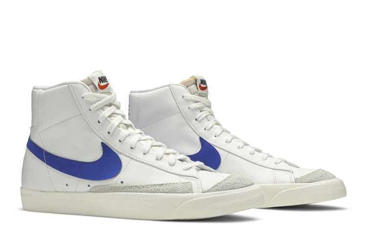 The Nike Blazer Mid 77 Vintage Racer Blue features a summit white and racer blue-sail colorway with a white leather upper and grey suede panels. It includes racer blue accents...