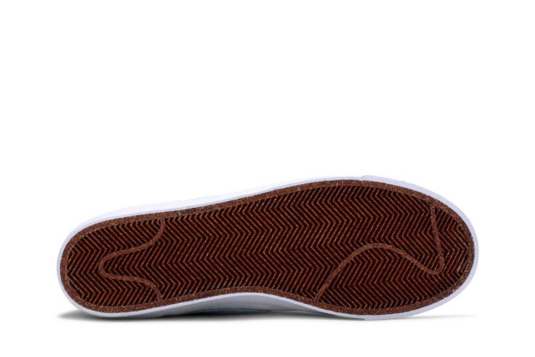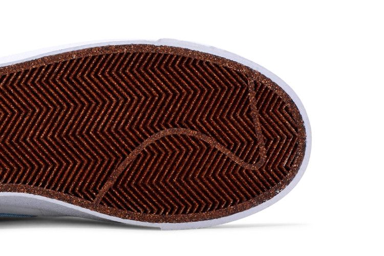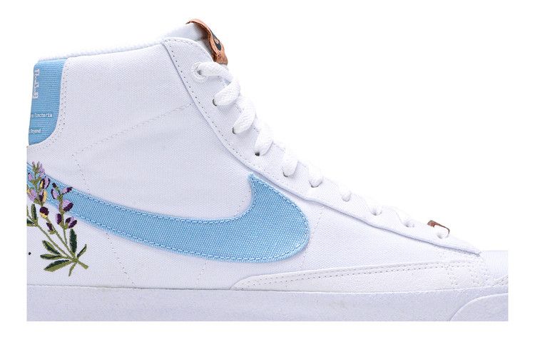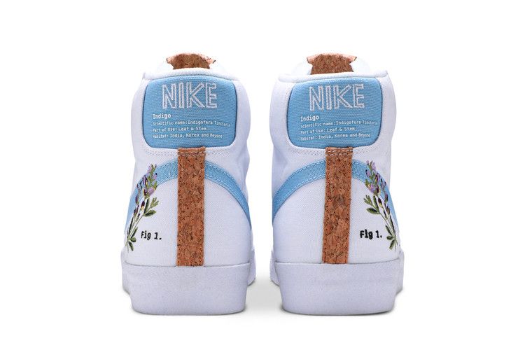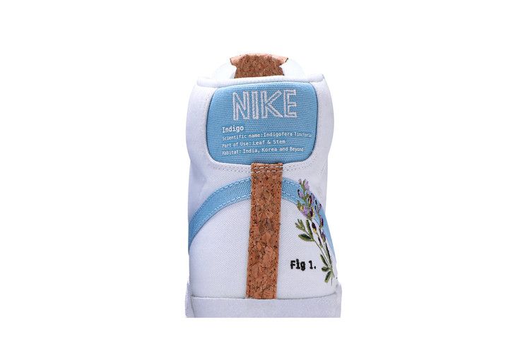 The Nike Blazer Mid 77 Indigo (W) features a white canvas upper with synthetic suede overlays and an embroidered Indigo plant graphic. It includes a light blue Swoosh and heel...
