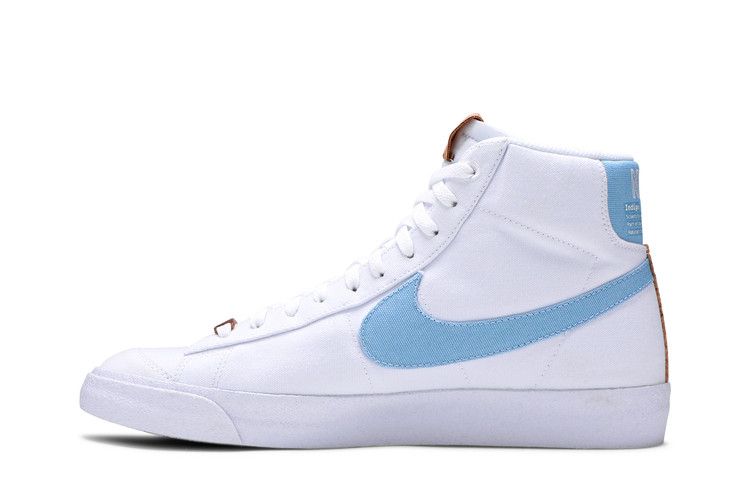 The Nike Blazer Mid 77 Indigo (W) features a white canvas upper with synthetic suede overlays and an embroidered Indigo plant graphic. It includes a light blue Swoosh and heel tab engraved with True Indigo’s scientific details. The design is completed with a white midsole and rubber outsole.