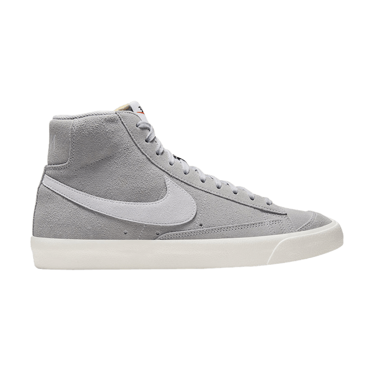 The Nike Blazer Mid 77 Wolf Grey features a suede upper in Wolf Grey for a refined look. It includes a grey mesh collar lining, a nylon tongue with exposed brown foam, and a white tongue tag with black "NIKE" embroidery and an orange Swoosh. The design incorporates a small toe box and a retro Pure Platinum Swoosh on the sidewalls. A white herringbone outsole completes the vintage aesthetic.