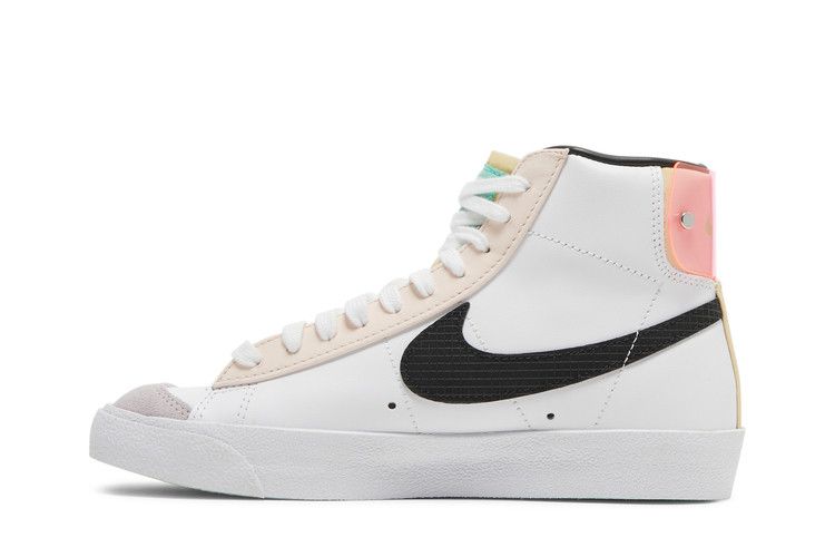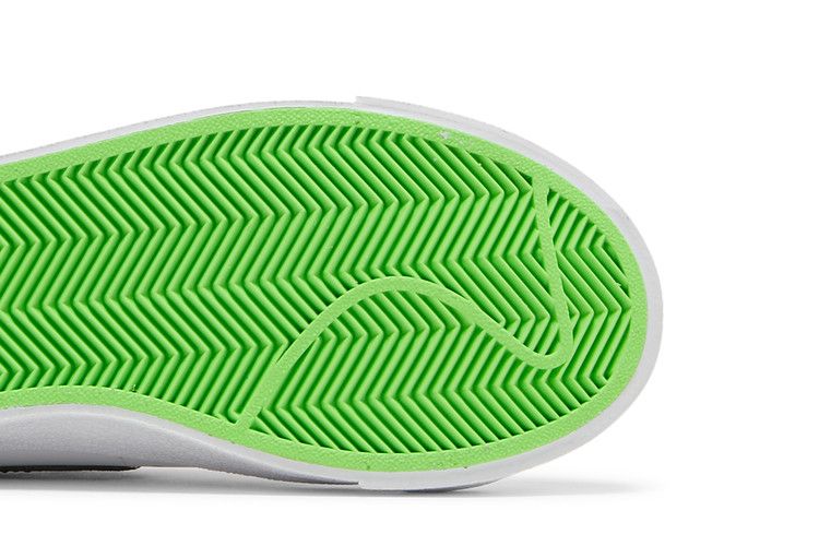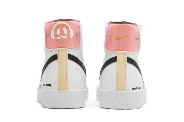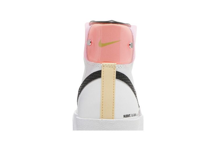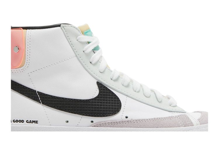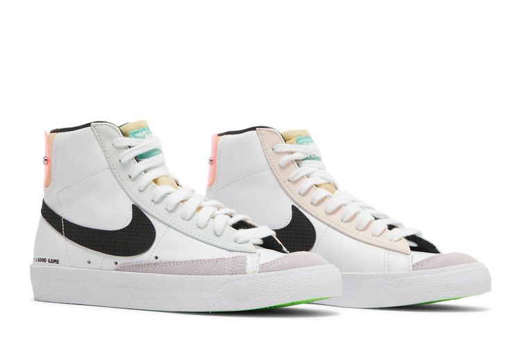 The Nike Blazer Mid Have a Good Game (W) features a white leather base with gray suede overlays and a green rubber outsole. Digital-inspired detailing and a translucent heel tag...