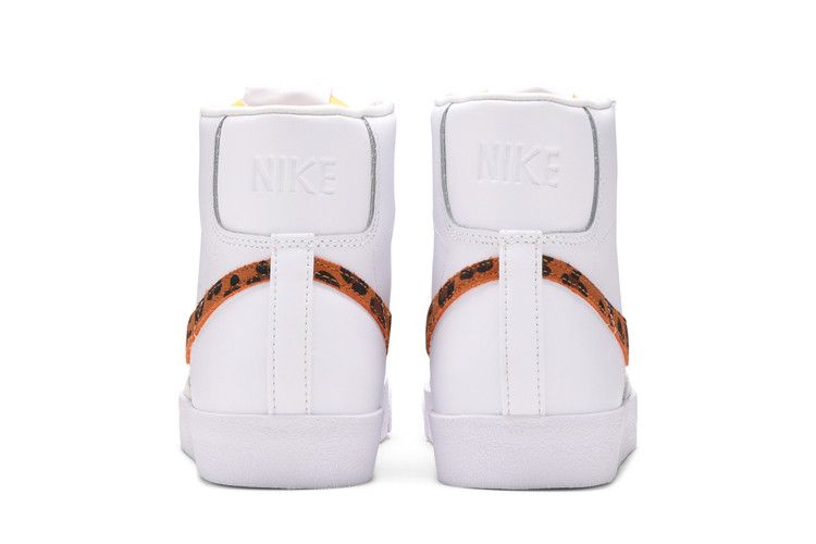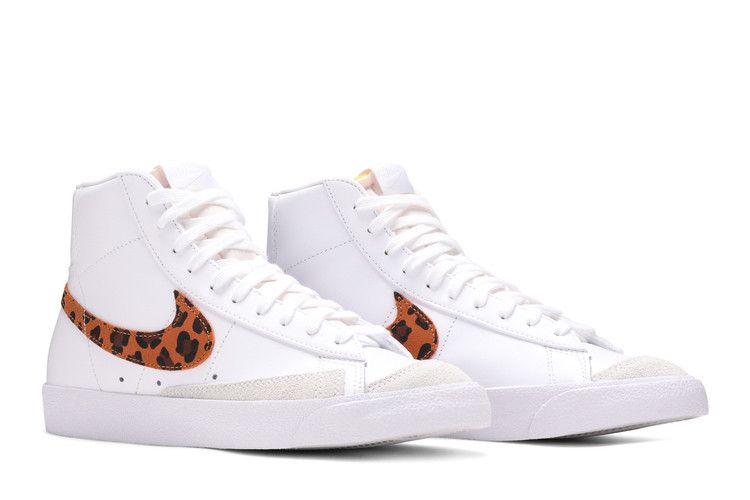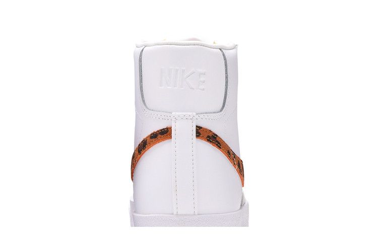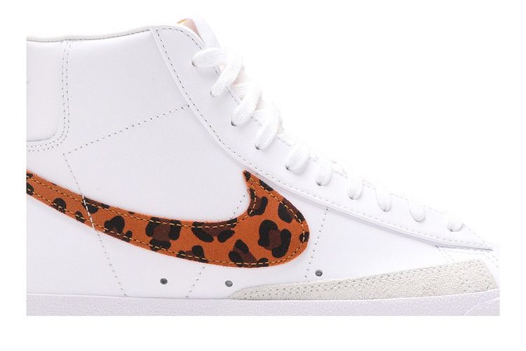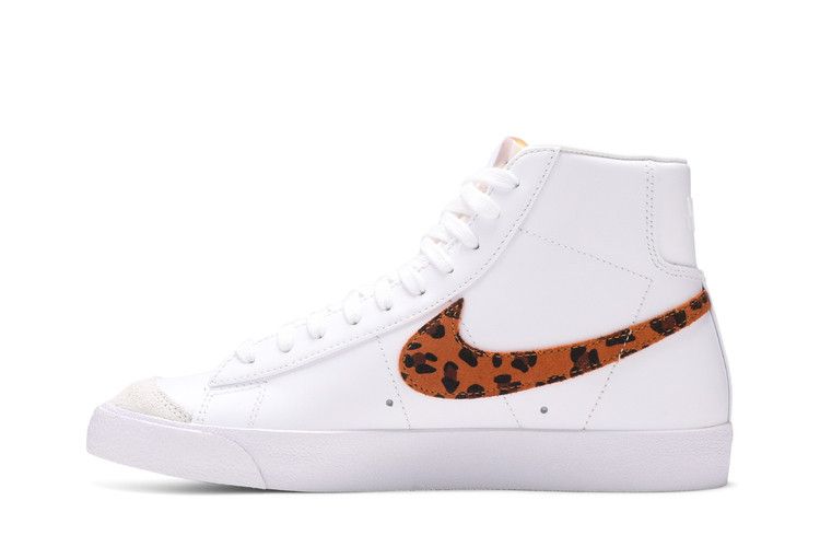 The Nike Blazer Mid Leopard (W) features synthetic leather and rubber construction with a white base and leopard-print Swooshes. It includes Nike branding on the heel and tongue, along with...