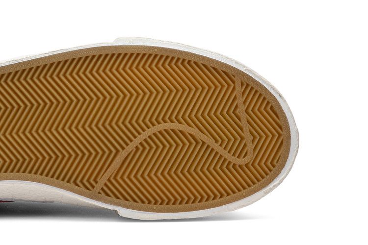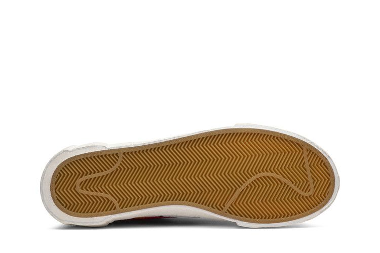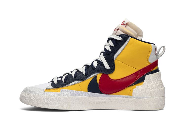 The Nike Blazer High sacai Snow Beach features a yellow upper with blue accents, dual red and blue Nike Swoosh branding, a white midsole, and white rubber sole. Released on May 2019, the Nike Blazer High sacai Snow Beach is available now at Side Kicks.