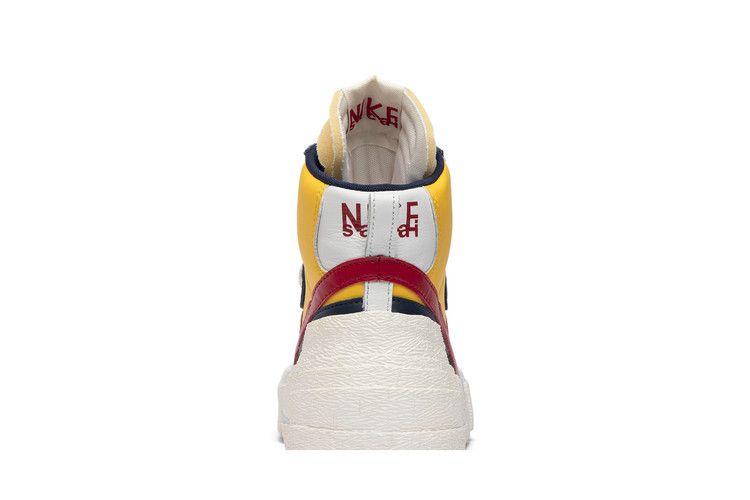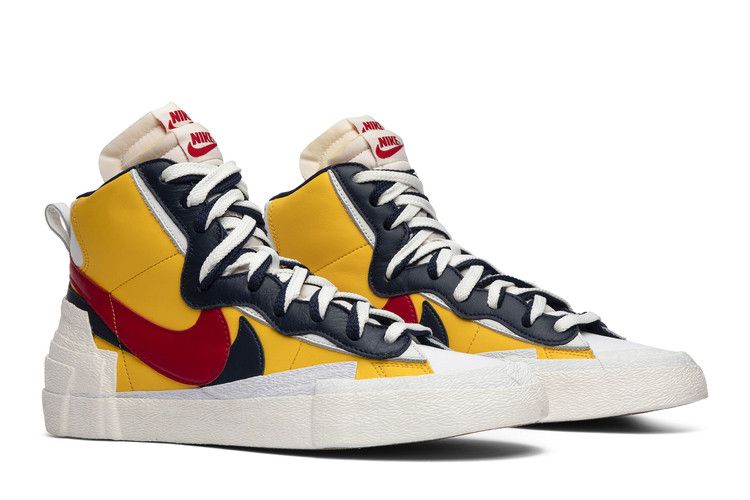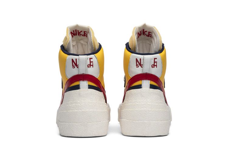 The Nike Blazer High sacai Snow Beach features a yellow upper with blue accents, dual red and blue Nike Swoosh branding, a white midsole, and white rubber sole. Released on...