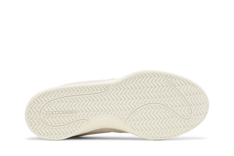 The upper combines Light Orewood Brown leather with off-white woven textile panels. Tonal Swoosh logos feature off-white stitching, while the midsole includes a Zoom Air unit and Cushlon 2.0 Foam. TPU sidewalls provide reinforcement, and micro-perforated suede on the heel collar adds subtle texture.