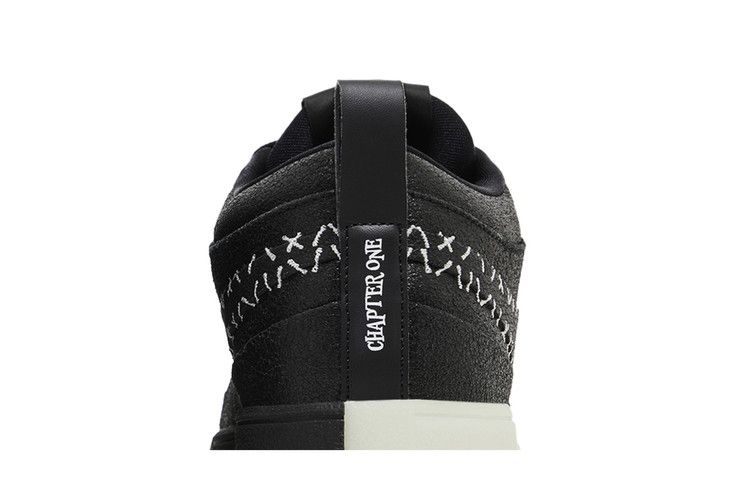 The Nike Book 1 Halloween features a black smooth leather upper with a subtle glitter finish. Perforations on the toe box enhance breathability, while tonal overlays reinforce the toe cap and heel. A white Swoosh mimics hand-stitched monster detailing, complemented by Clay Orange branding on the tongue. The heel pull tab displays "Chapter One" in white text, and the shoe rests on a black and white midsole.