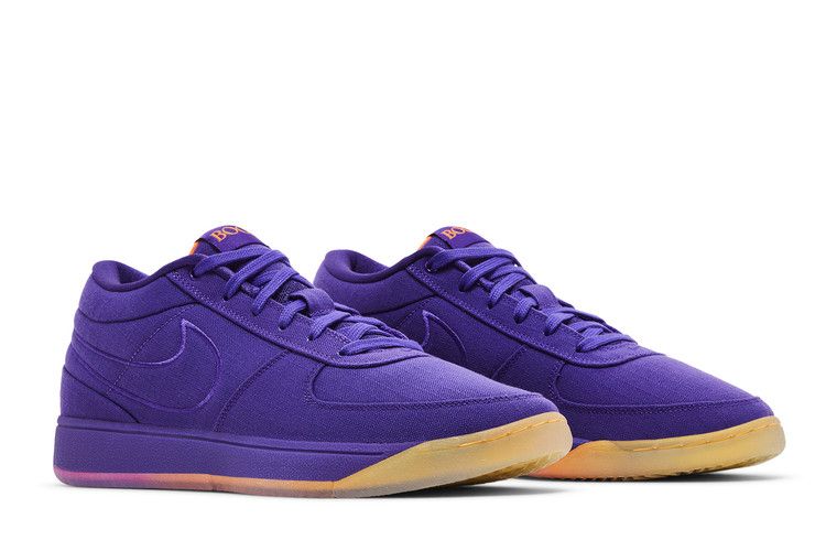 The Nike Book 1 Sunset features a durable canvas-style textile upper in Court Purple, inspired by sunset hues. The design includes purple embroidered Swoosh logos, Total Orange tongue branding, and...