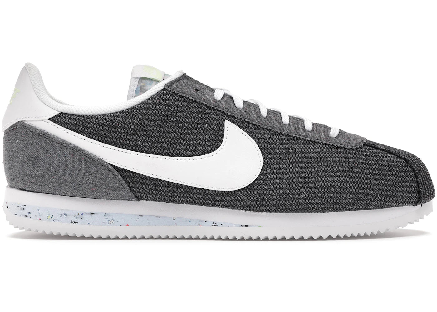 The Nike Classic Cortez Recycled Canvas features a dark gray and white colorway with a low-top silhouette. Constructed from recycled fabrics, it includes a foam midsole and reinforced ankle support for stability. The design retains the vintage Cortez profile with a textured finish and the signature Swoosh logo. Released on August 20, 2020, the Nike Classic Cortez Recycled Canvas is available now at Side Kicks.