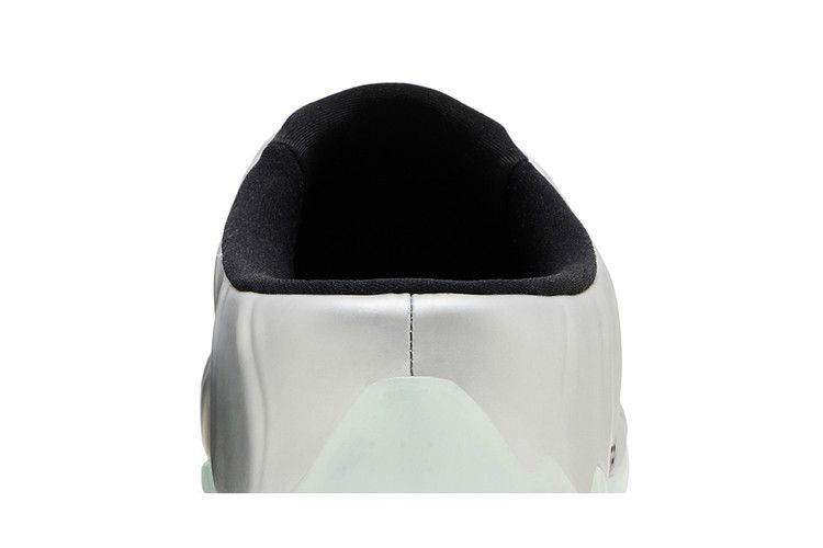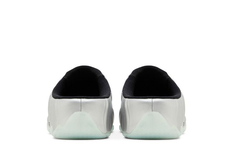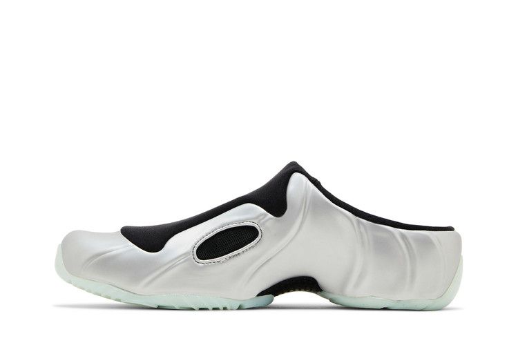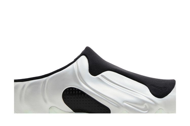 The Nike Clogposite Chrome features a clog-styled design with a silver and black finish. It has mesh side panels for breathability and a black foam upper on a silver base....