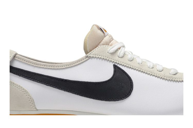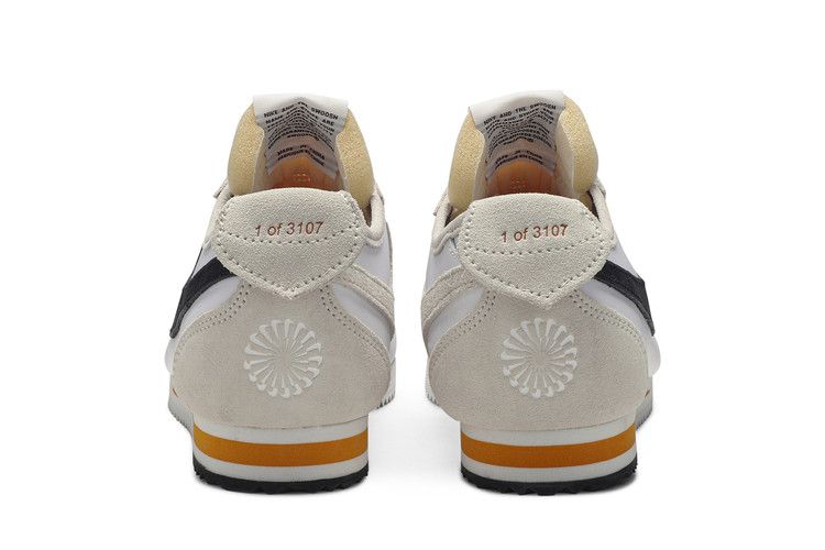It features a white leather upper with pale ivory suede overlays on the vamp and eyestays. The padded tongue includes an orange Swoosh and "Nike" branding, while the quarter panels display a retro black Swoosh. The heel tab is marked "1 of 3107," referencing Nike’s first address. A foam midsole adds vibrant orange accents, and a herringbone toe cap enhances the design.