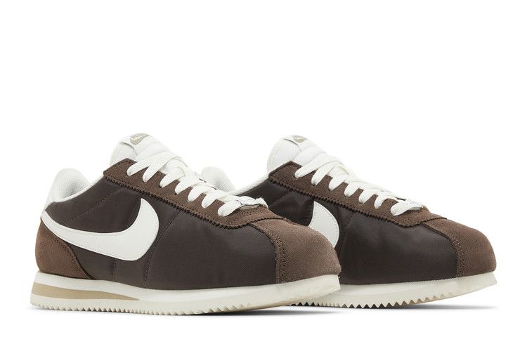 The Nike Cortez Baroque Brown (Women's) features a Baroque Brown, Sail, and khaki colorway. It has a soft foam midsole in Sail with a khaki wedge for cushioning. The rubber outsole includes a jagged design for traction. The textile upper and suede details are in Baroque Brown, while Sail accents appear on the Swoosh, laces, tongue, and heel tab. Released on April 2, 2024, the Nike Cortez Baroque Brown (Women's) is available now at Side Kicks.