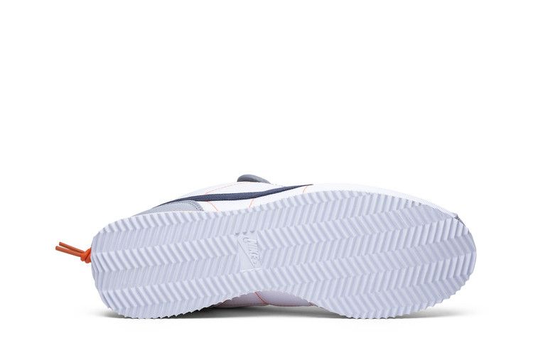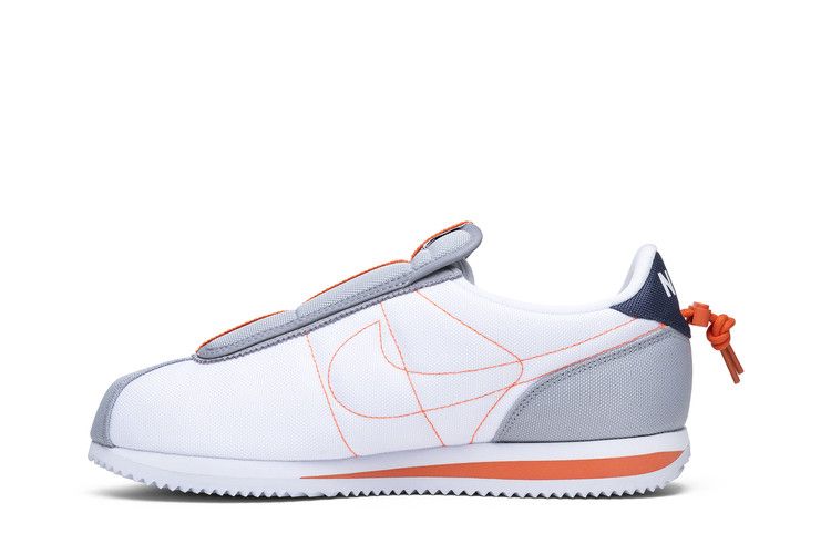 The Nike Cortez Basic Slip Kendrick Lamar White features an all-white upper with grey accents, a blue Nike Swoosh, and a white midsole with orange detailing. The design draws inspiration from West Coast aesthetics. Released on October 2018, the Nike Cortez Basic Slip Kendrick Lamar White is available now at Side Kicks.