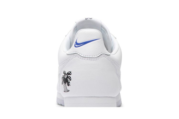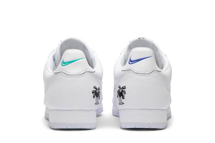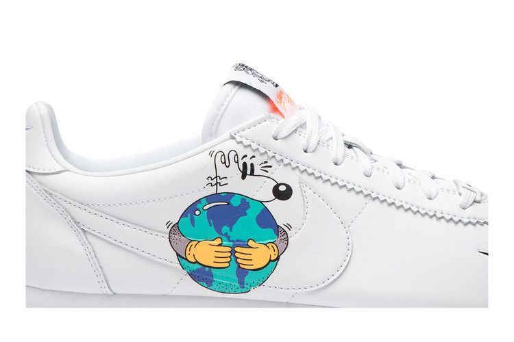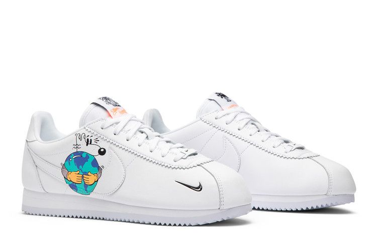 The Nike Cortez Flyleather Steve Harrington Earth Day (2019) features a white upper with blue and green accents, dual white and black Nike Swoosh branding, a white midsole, and a...