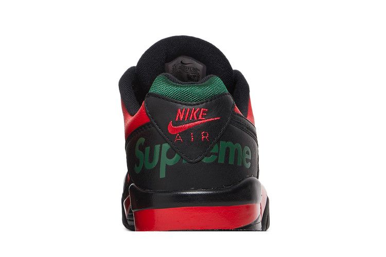 The Nike Air Cross Trainer Low Supreme Black Green Red has a premium perforated green leather upper with smooth black and red leather overlays, plus a black Swoosh. The tongue and collar use mesh fabric, while debossed and embroidered Supreme and Nike logos adorn the heel.