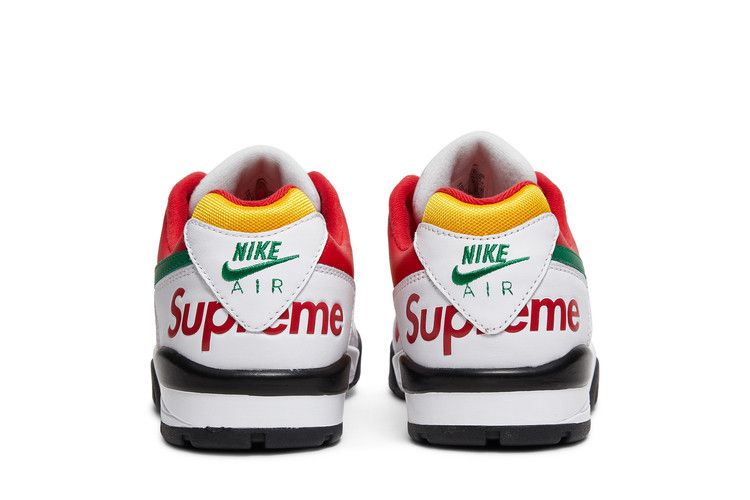 The Nike Air Cross Trainer Low Supreme White Yellow Red has a premium perforated yellow leather upper with smooth white and red leather overlays, plus a green Swoosh. The tongue and collar are made of mesh fabric. The heel features debossed and embroidered Supreme and Nike logos.