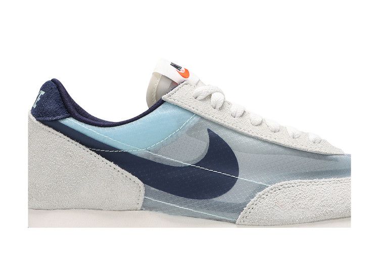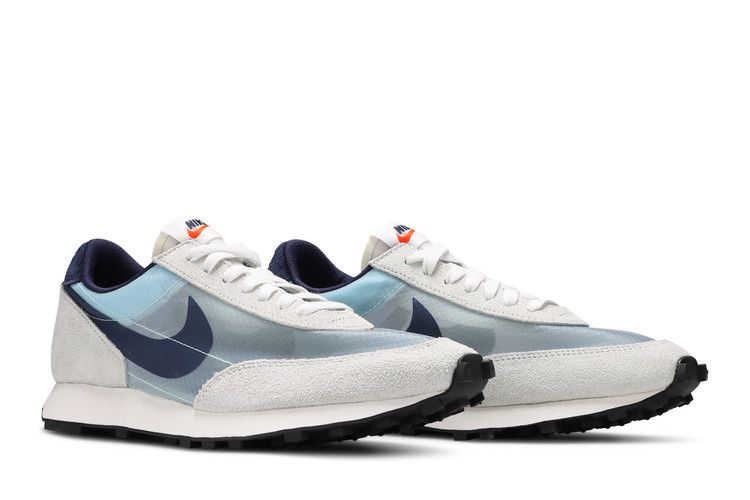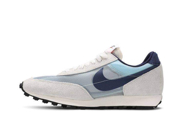 The Nike Daybreak Teal Tint Midnight Navy features a translucent synthetic textile upper with teal hues and light grey suede overlays. It includes a white midsole, black waffle-pattern outsole for...
