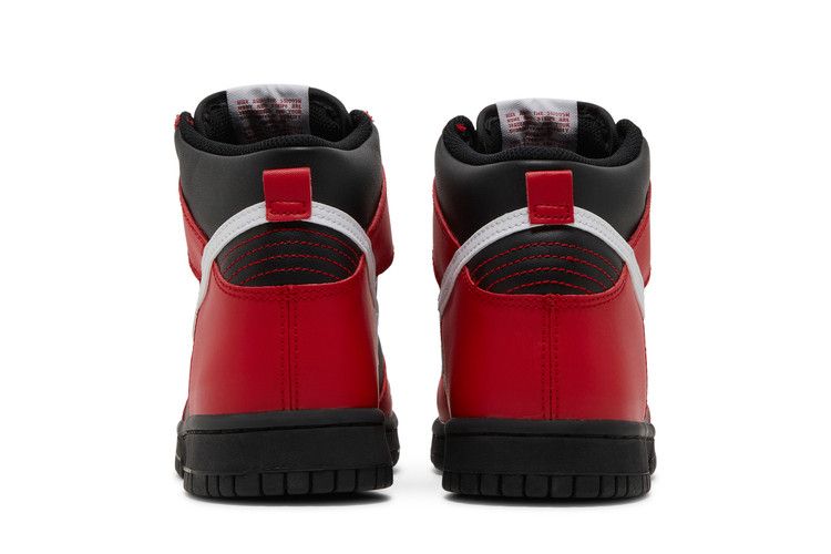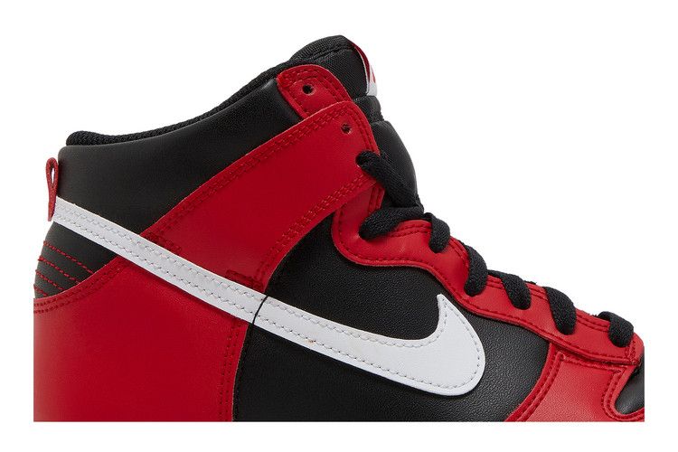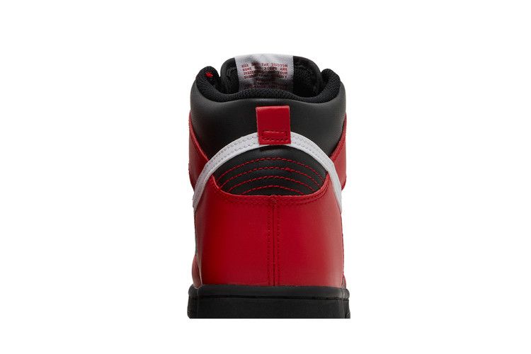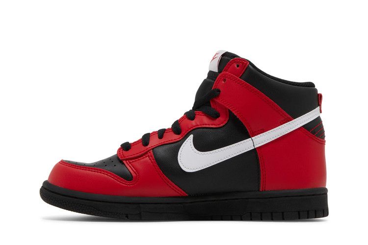 The Nike Dunk High Deadpool (GS) features a leather upper with black base and red overlays, accented by white Swooshes on both sides. Red stitching details the heel, while the...