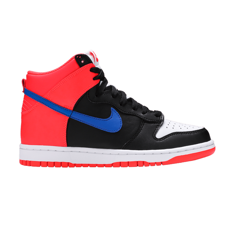 The Nike Dunk High Knicks (GS) features a black and Bright Crimson leather upper with white and Game Royal accents. It includes a padded tongue and collar for comfort, along...