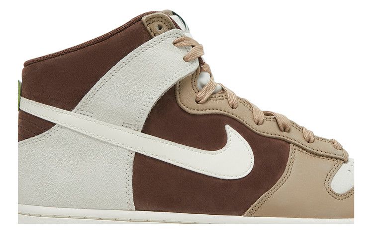 The Nike Dunk High Light Chocolate features a tonal brown and Sail color scheme with premium suede and leather construction. Green accents on the woven tongue label and heel tab...