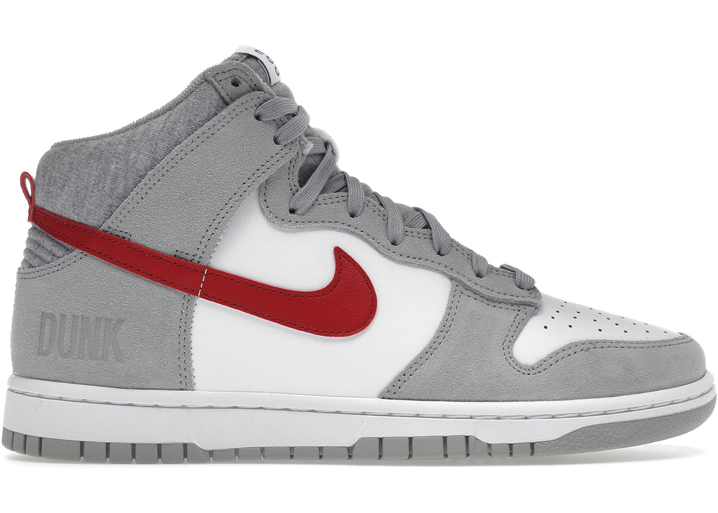 Released on June 28, 2022, the Nike Dunk High Light Smoke Gray Gym Red is available now at Side Kicks.