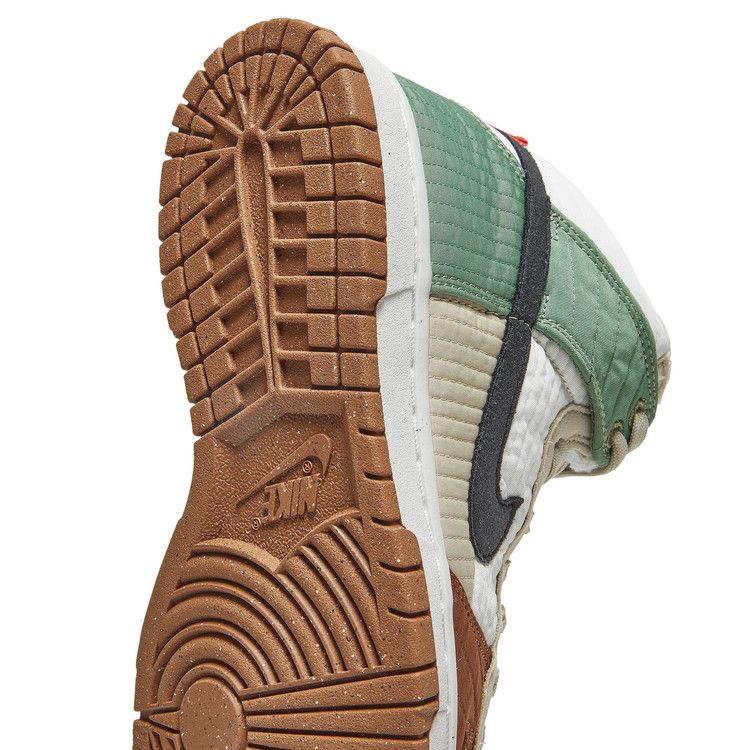 The women’s exclusive Nike Dunk High Next Nature Summit White (W) has a multicolor quilted upper with fleece lining and suede eyestays. It includes a black Swoosh and brown speckled outsole. The design uses 20% recycled materials by weight.