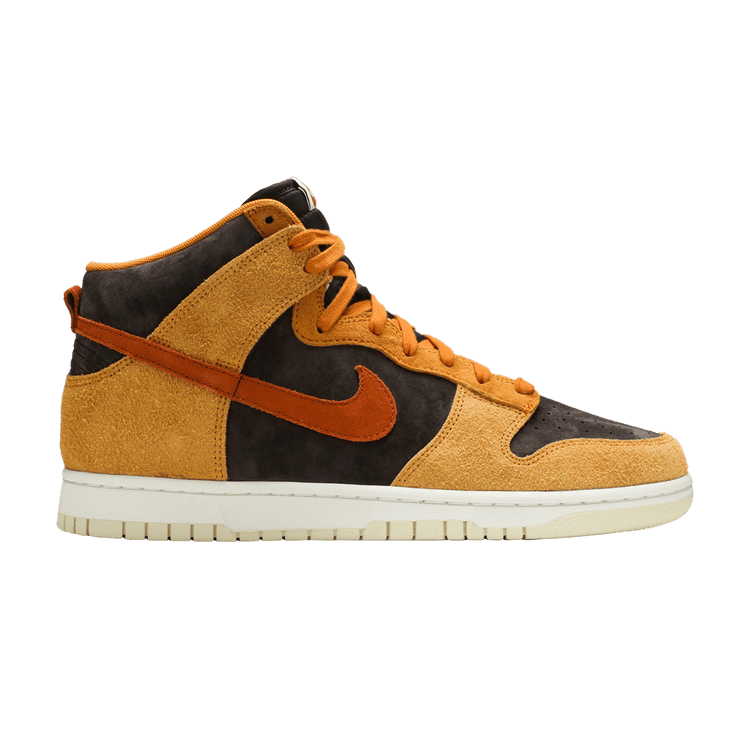 The Nike Dunk High PRM Dark Russet features a suede upper in Dark Russet with Velvet Brown hairy suede overlays. It includes a Dark Curry Swoosh and a white and...