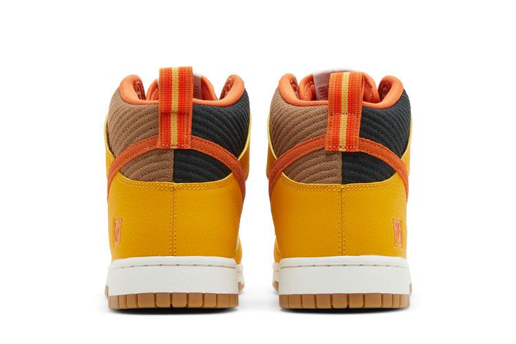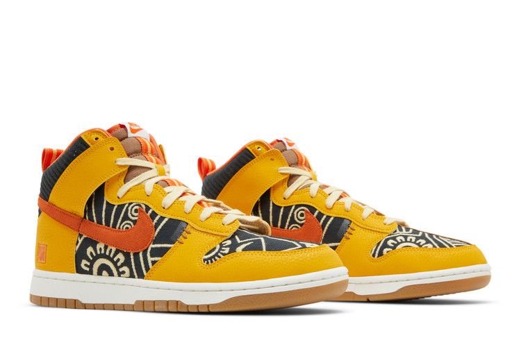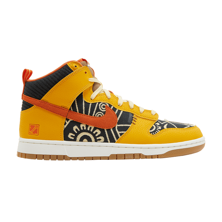 The Nike Dunk High PRM Somos Familia features a synthetic leather and suede upper with a rubber sole. Color options include Starfish, Dark Driftwood, Sail, Lemon Wash, Off-Noir, and black....