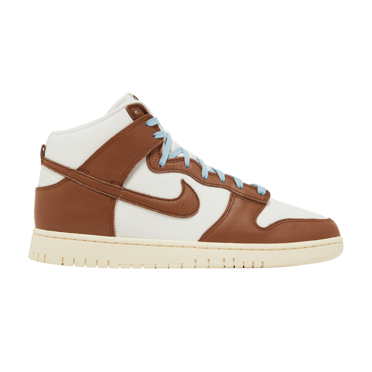 The Nike Dunk High PRM Certified Fresh Brown combines a pecan brown and white two-tone design with university blue lacing for contrast. A white canvas-like base pairs with tumbled brown leather overlays, while a sail-colored rubber outsole provides durability and a retro aesthetic. Released on September 9, 2022, the Nike Dunk High PRM Certified Fresh Brown is available now at Side Kicks.