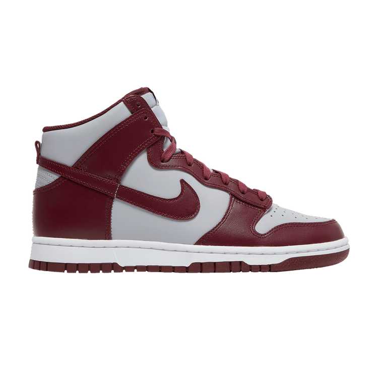 The Nike Dunk High Dark Beetroot features a burgundy sole with a white midsole and cool grey base. Wine-colored accents cover the toe, side panels, heel, tongue, and Swoosh. The...