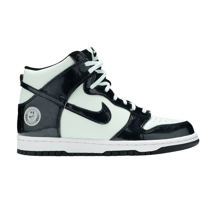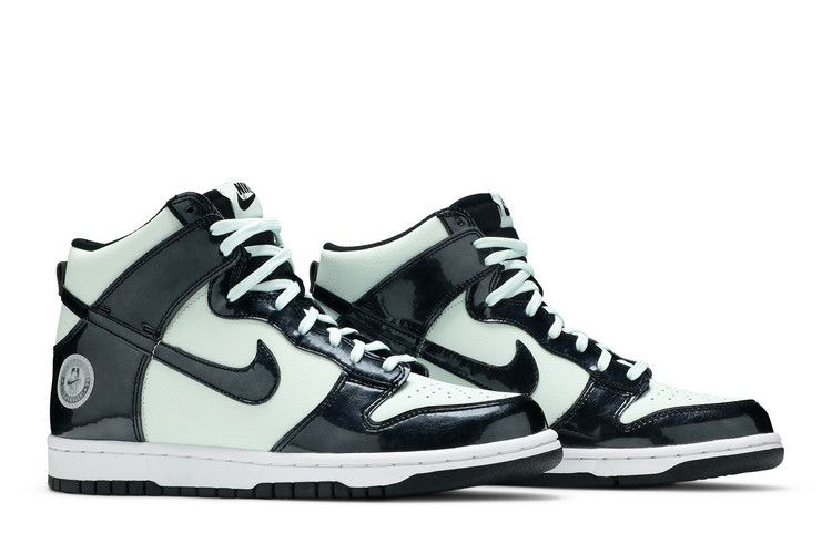 The Nike Dunk High SE All-Star 2021 GS features a white, green, and black color scheme with leather, suede, and rubber construction. It includes dual Swooshes meeting at the heel,...