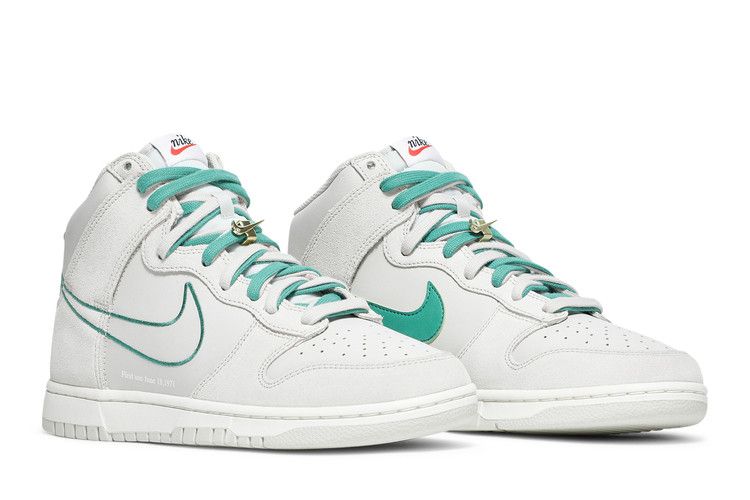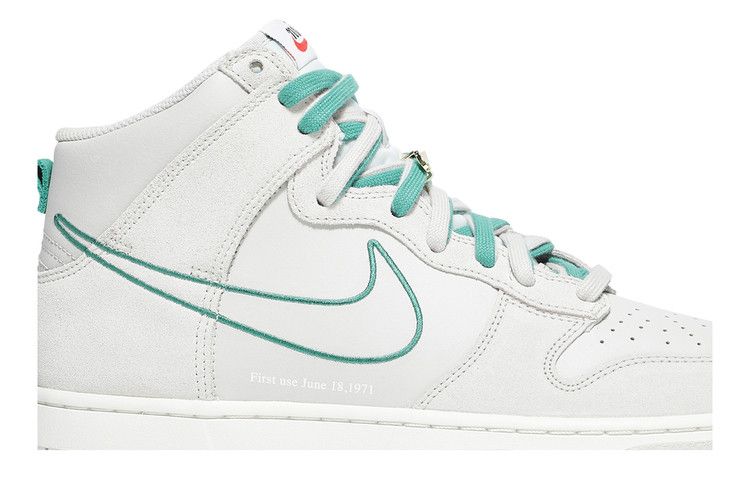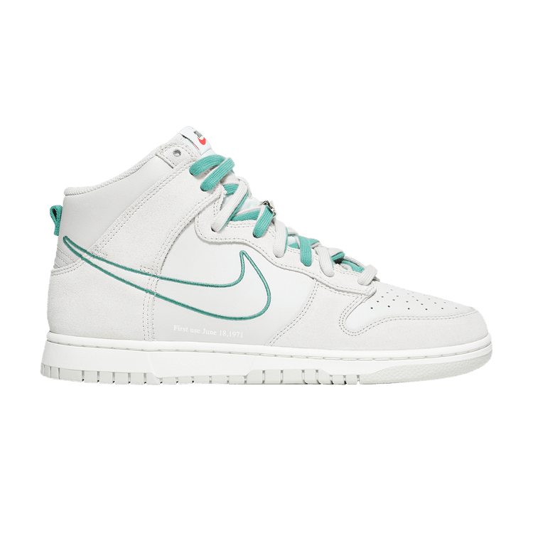 The Nike Dunk High SE First Use Sail GS features a premium leather upper in Sail color with diamond print texture. It has a non-marking rubber outsole with herringbone traction for grip. Special details include a "First Use June 18, 1971" side tag and heel text marking Nike's first Swoosh use. The Light Bone colorway contrasts with a Green Noise Swoosh for a retro-inspired look.