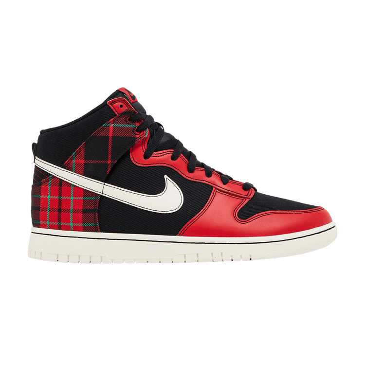 The Nike Dunk High SE Tartan Plaid Black University Red features a black twill base with University Red leather overlays on the toe cap and eyestays. White tumbled leather forms...