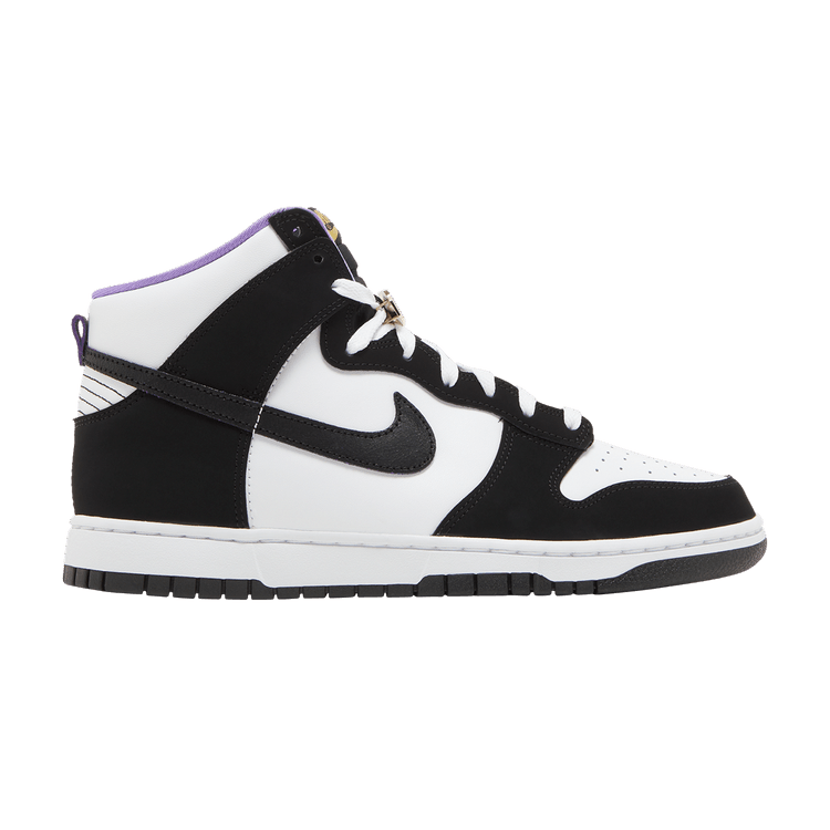 The Nike Dunk High SE World Champs features a white nubuck upper with black overlays and Action Grape interior liners. Gold-plated lace dubraes shaped like wrestling championship belts add a...