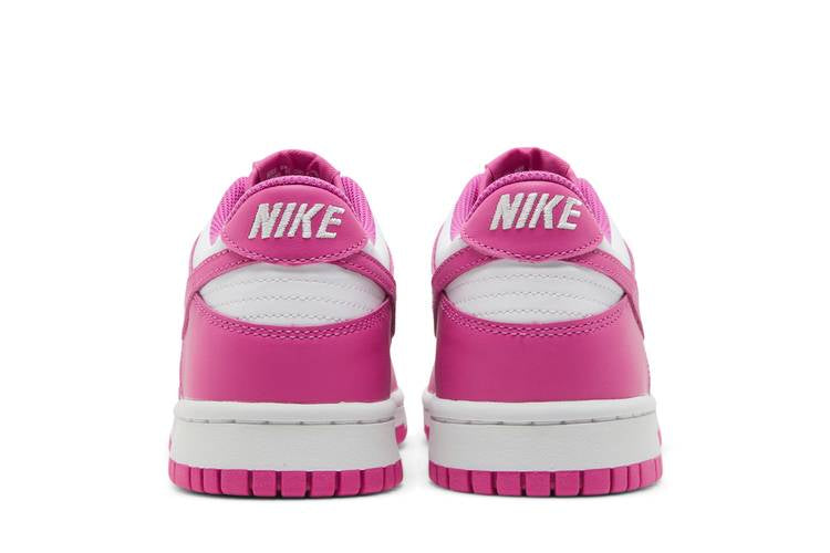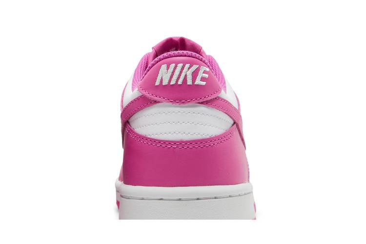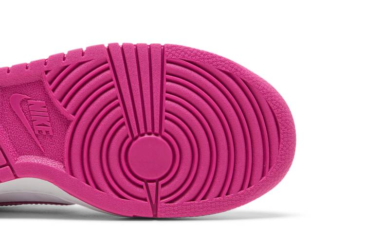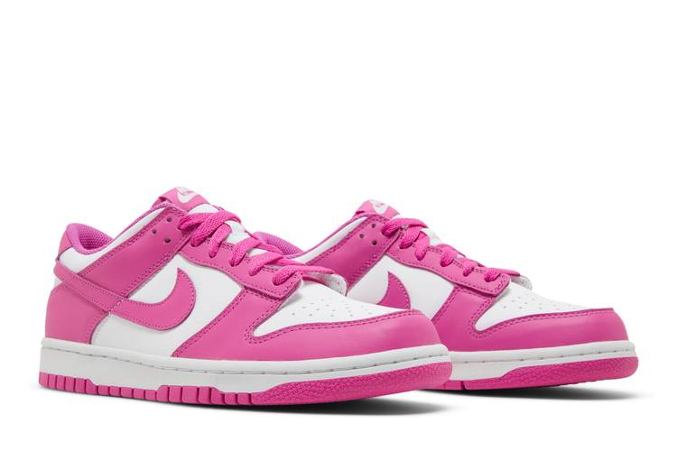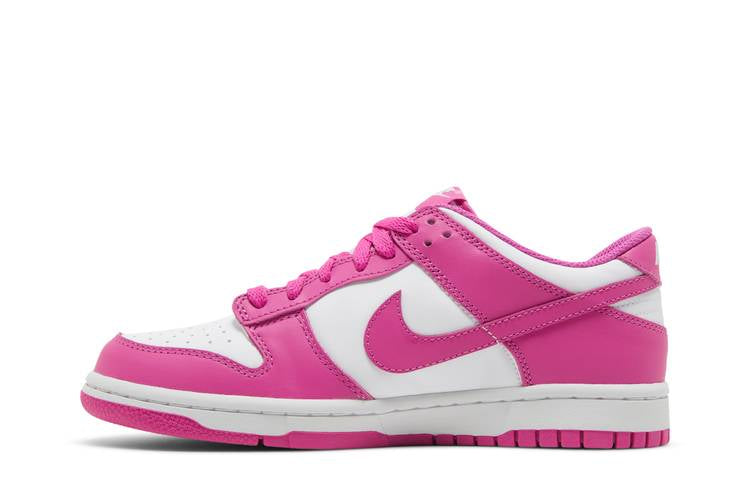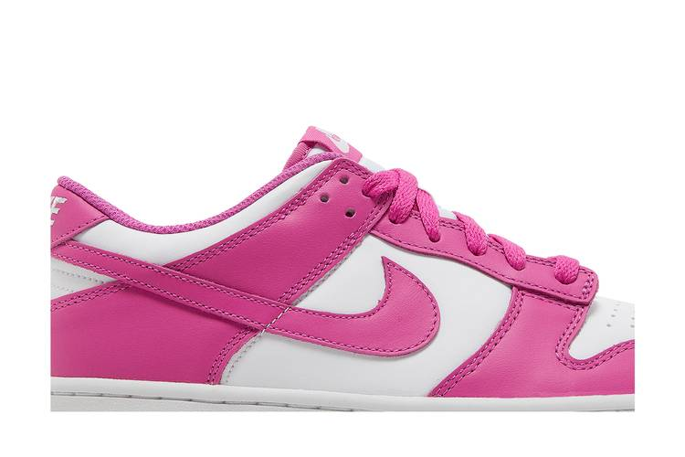 The Nike Dunk Low Active Fuchsia (PS) is a children's sneaker featuring a white leather upper with vibrant pink overlays. The shoe includes a woven tongue tag, leather heel tab,...