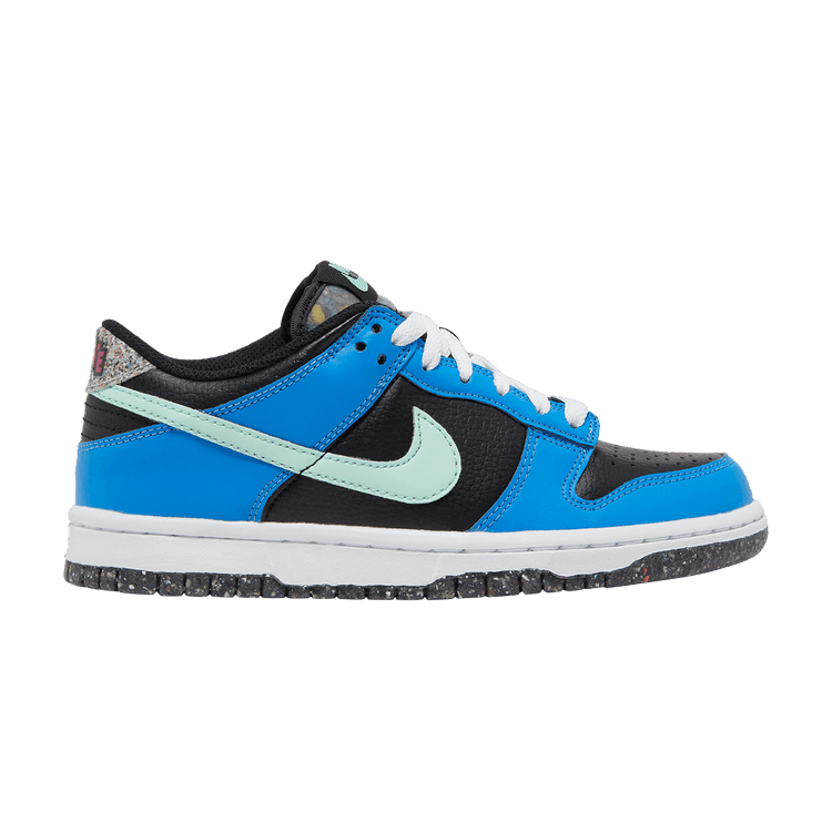 The Nike Dunk Low Crater Blue Black (GS) features a black upper with royal blue overlays and turquoise green Swoosh branding. The tongue displays matching Nike branding, while white laces...