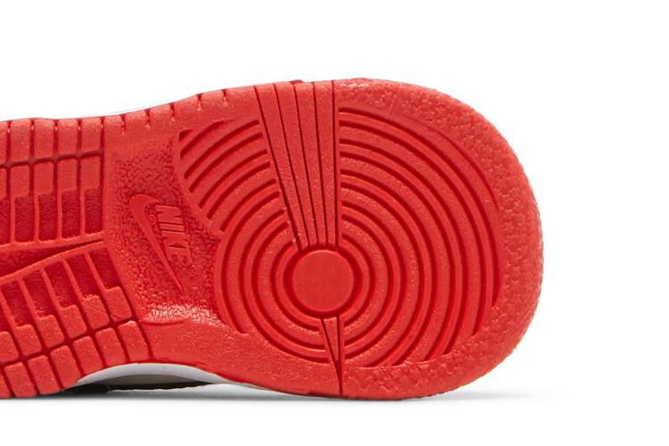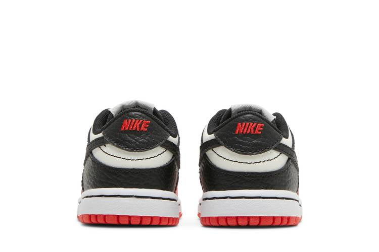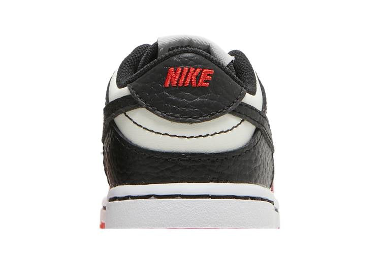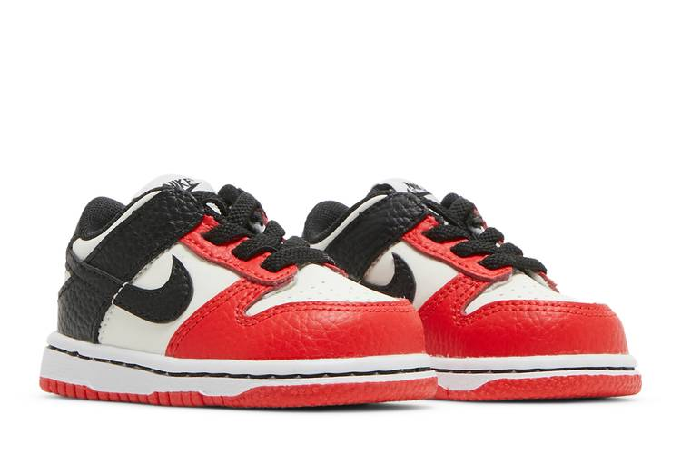 The Nike Dunk Low EMB NBA 75th Anniversary Chicago (TD) is a tribute to the NBA's 75th anniversary with a Chicago Bulls-inspired colorway. The shoe features an all-leather upper with off-white, Chile Red, and black overlays, along with traditional branding elements like a Nike tongue tag and embroidered heel tab. The sneaker is completed with a white midsole and scarlet rubber outsole. Celebrate basketball history with this iconic design.