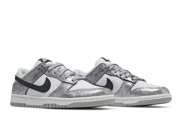 The Nike women's Dunk Low ‘Golden Gals’ boasts a shimmering design with silver-tone laces and metallic silver-flake leather overlays on a white textile base. Black accents on the Swoosh, tongue...