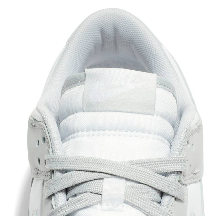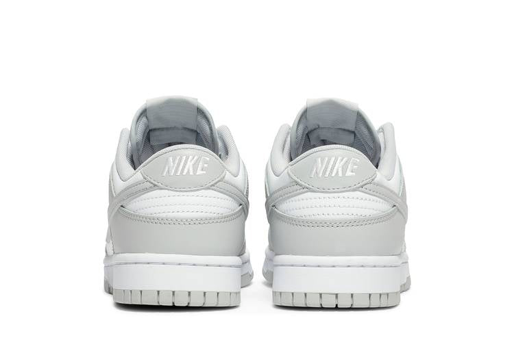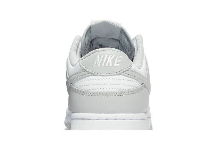 The Nike Dunk Low 'Grey Fog' showcases a two-tone colorway with a white leather upper and Grey Fog overlays. This classic silhouette, originally designed for college hoops in 1985, features a Swoosh, laces, and tongue tag in the same light grey hue. Additional Nike branding is found on the heel tab and padded sockliner. The shoe is set on a rubber cupsole with white sidewalls and a grey rubber outsole for a clean and timeless look.