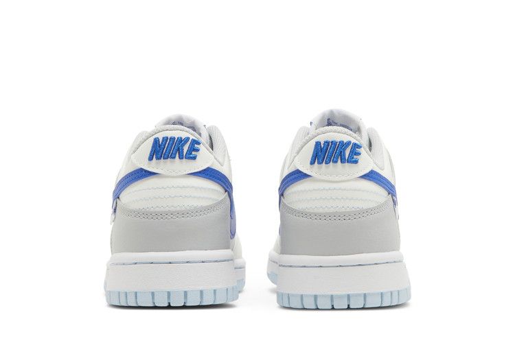 The Nike Dunk Low Ivory Hyper Royal GS features a smooth leather upper in grey and light cream tones with celestine blue detailing on the eyestays. It includes Royal Blue Swooshes, a perforated toe box, and branding on the lateral tag, woven tongue tag, insoles, and embroidered heel. The design is finished with a white rubber midsole and light blue outsole.