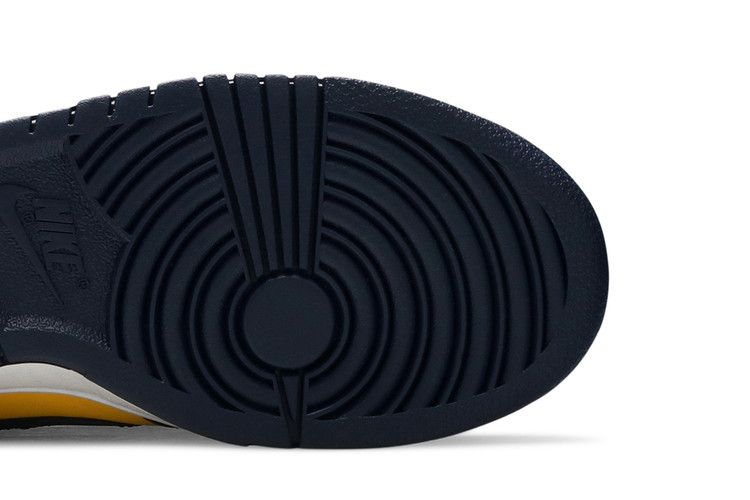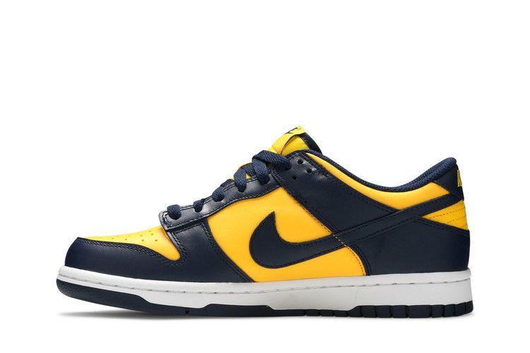 The Nike Dunk Low Michigan for grade school sizes (GS) features an all-leather upper in Midnight Navy and Varsity Maize colors, paying homage to the Wolverines of Ann Arbor. Retro details include a perforated toe box and a nylon tongue with a Nike tag. The design is inspired by the original 1985 'Be True to Your School' series, offering a timeless and classic look for young sneaker enthusiasts.